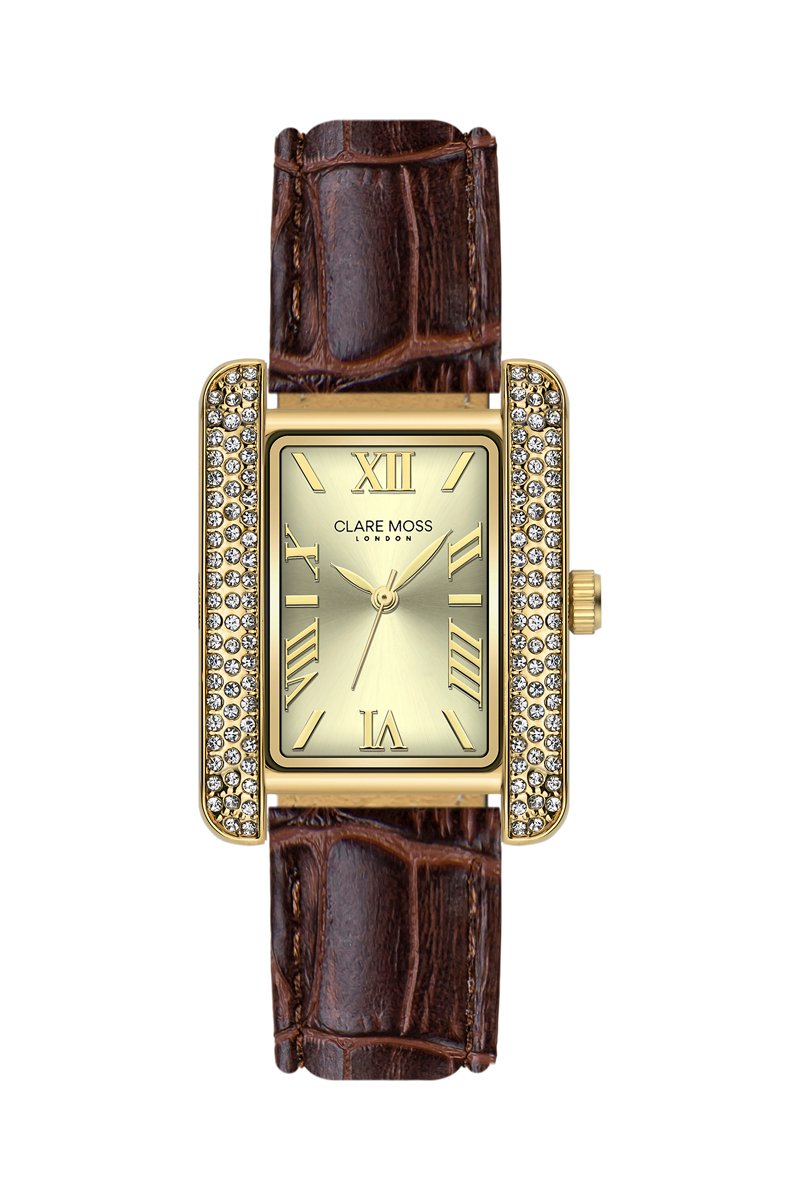 Kalfsleren Quartz Horloge met Zirkonia’s - Bruin en Goudkleurig