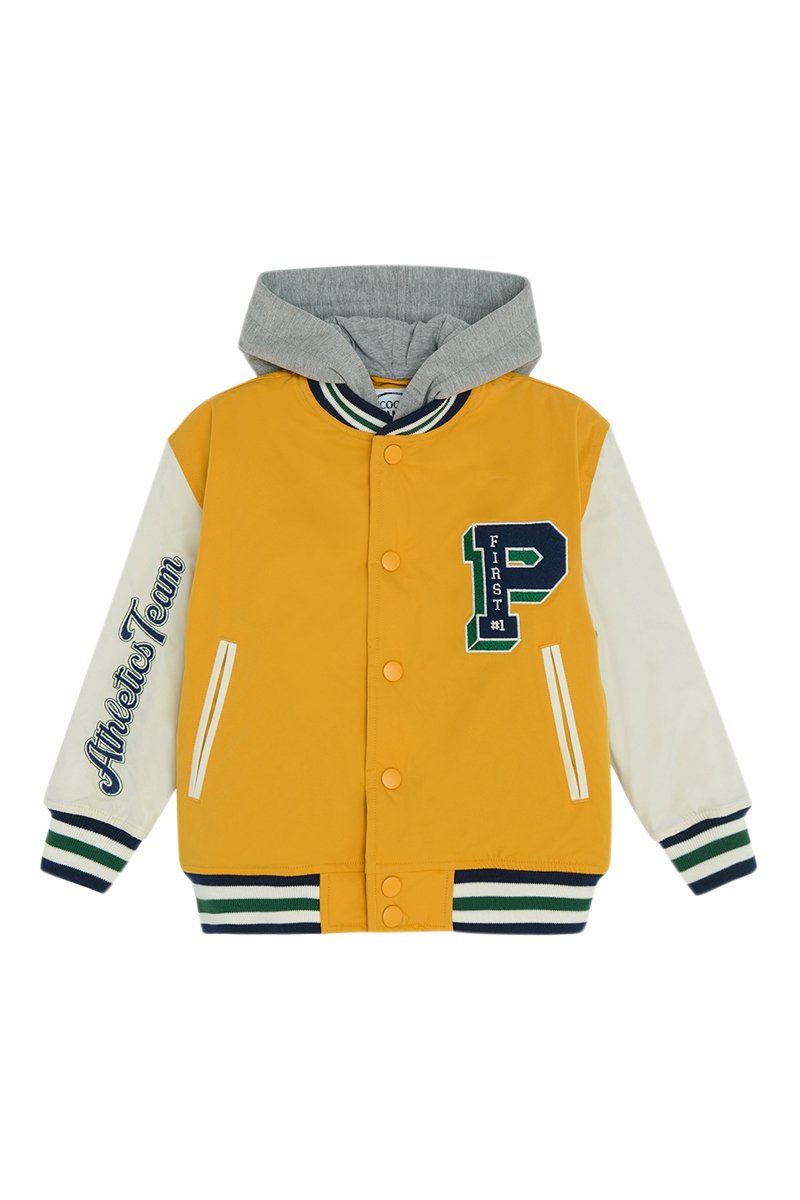 Geborduurde belettering op de linkermouw en aan de voorkant.
