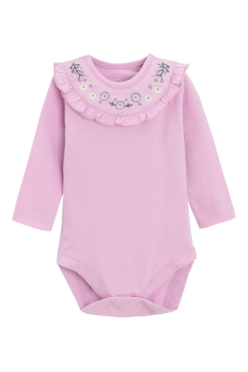 Geborduurde bloemmotief en plooien aan de voorkant.