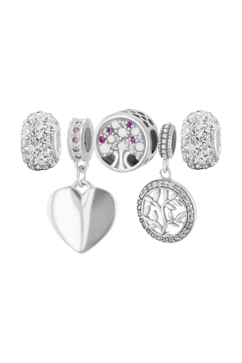 3 bedeltjes en 2 beads van zilver ingelegd met zirkonia's waarvan 2 hangende bedeltjes.