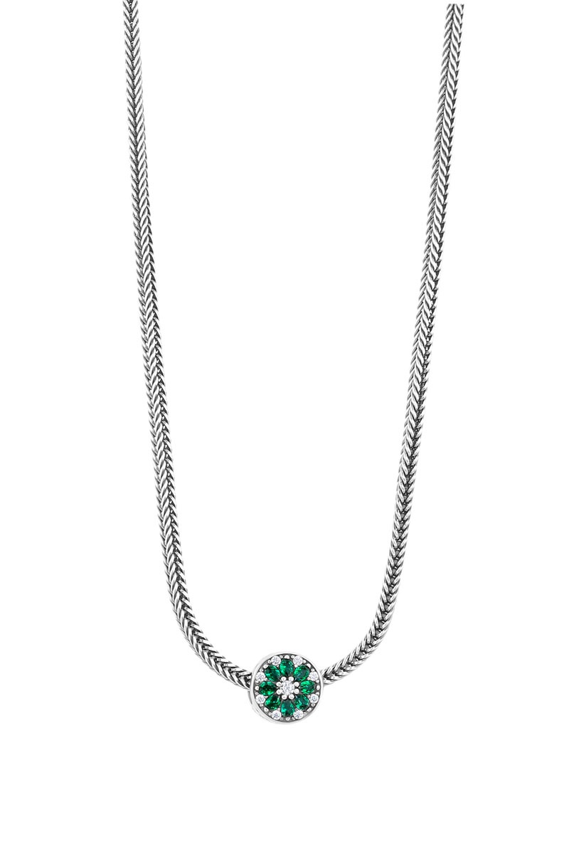Ketting van zilver en hanger ingelegd met kristallen.