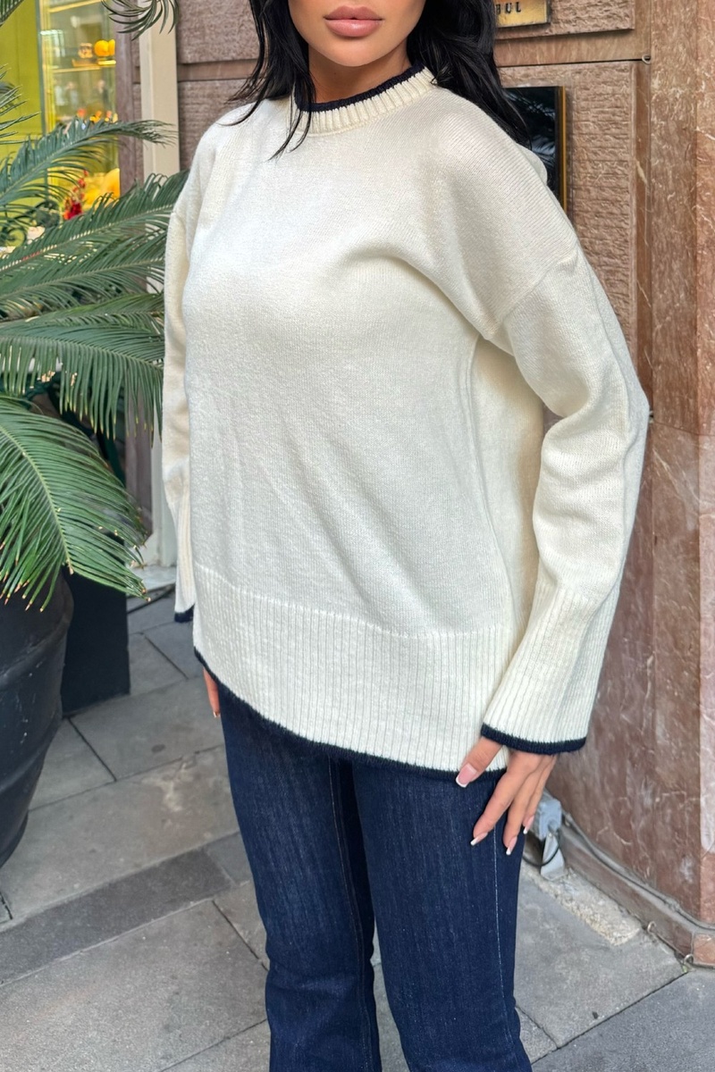 Streepmotief bij de hals, bij de mouwen en aan de onderkant.