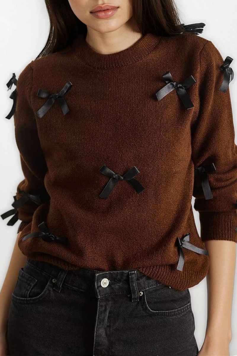 Satijnen strikjes op de mouwen en aan de voorkant.