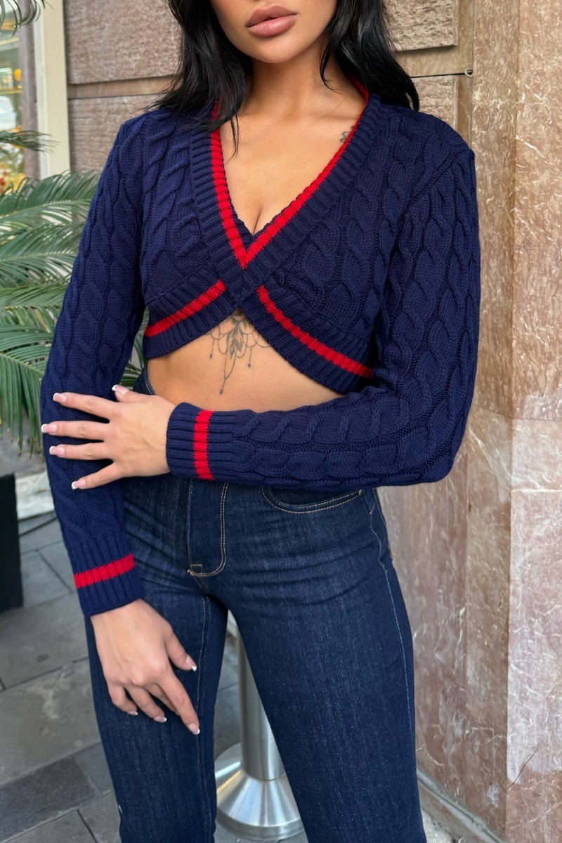 Streepmotief bij de hals, bij de mouwen en aan de onderkant.