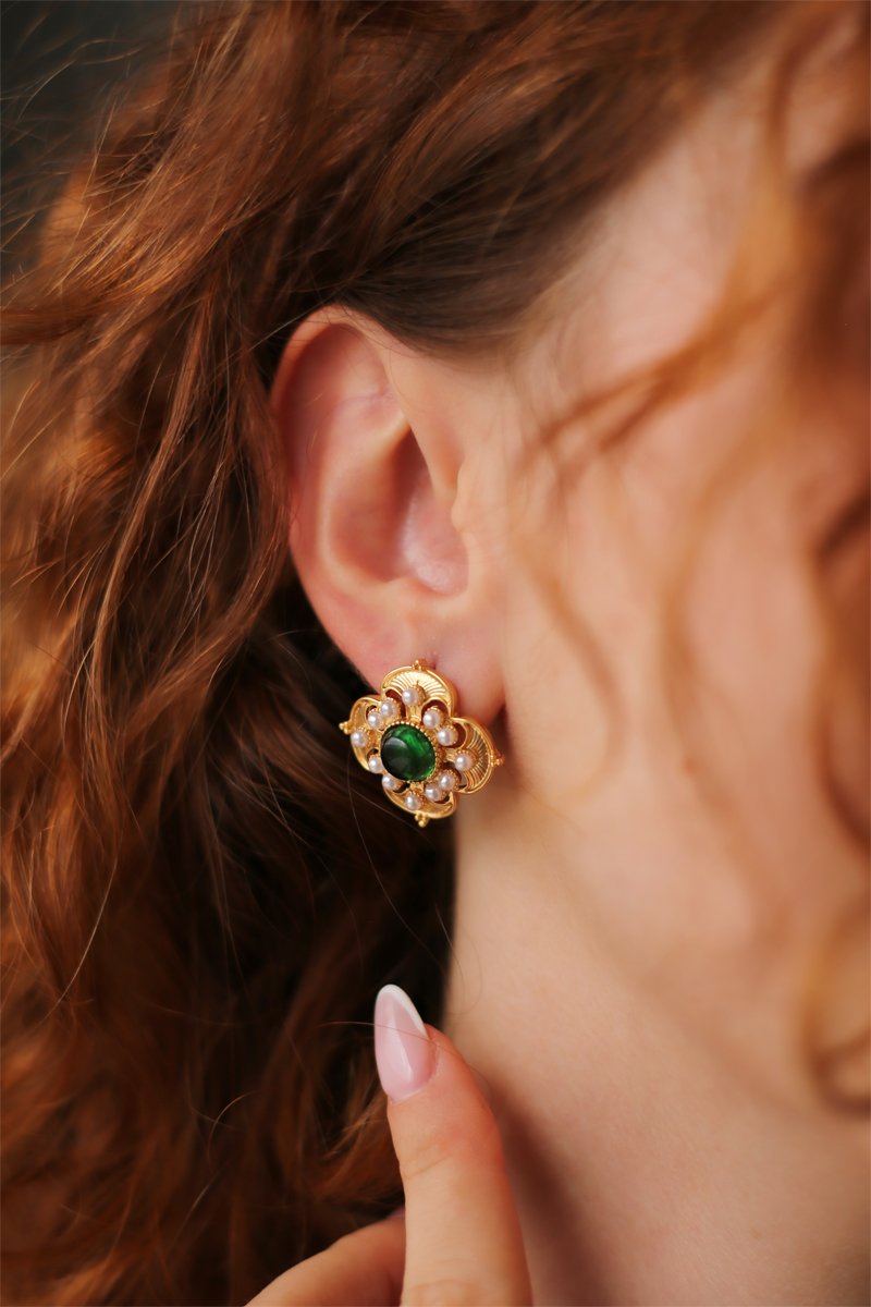 Oorbellen van verguld metaal ingelegd met parels en kattenogen>.