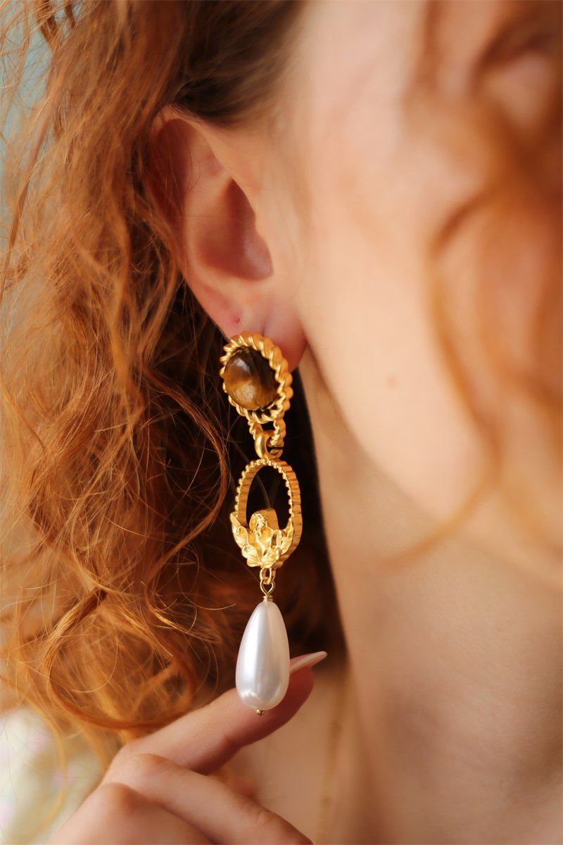 Oorbellen van verguld metaal ingelegd met tijgerogen.