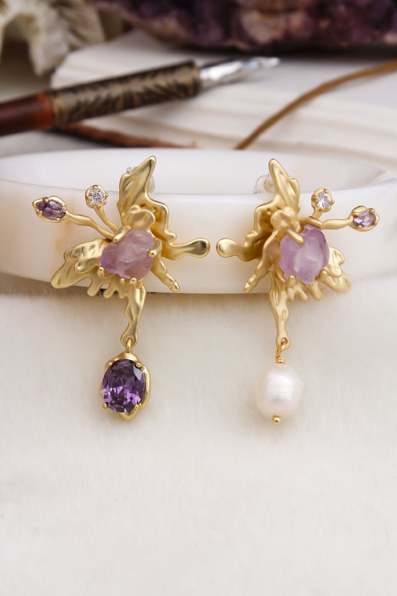 Materiaal: messing, koperkleurig, Amethisten en Cultivéparels