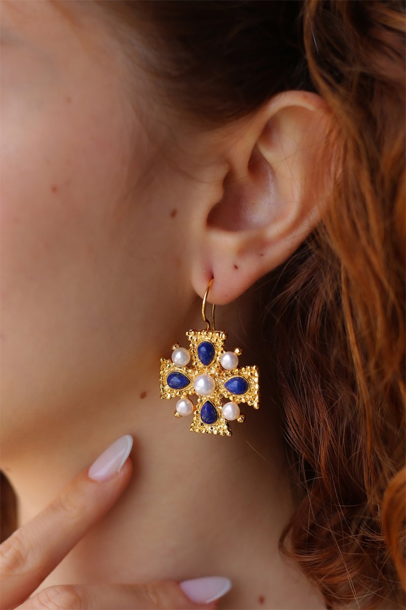 Hangende oorbellen ingelegd met kunstparels en 4 lapis lazuli.