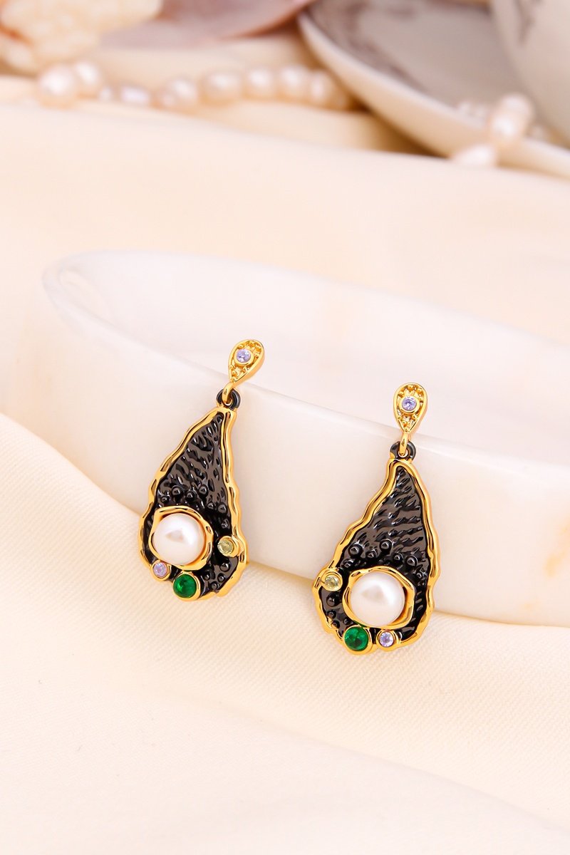 Hangende oorbellen van doublé geelgoud ingelegd met 4 kristallen en 1 kunstparel.