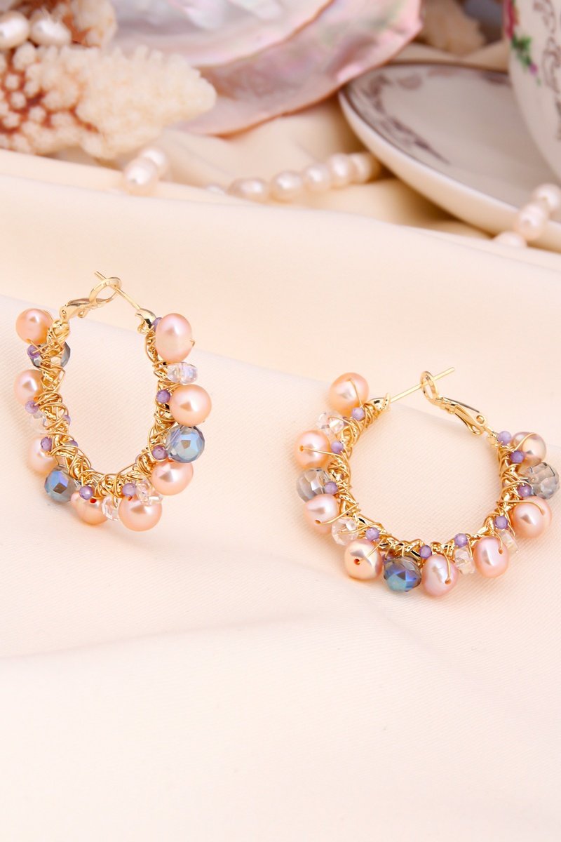 Creolen van doublé geelgoud ingelegd met kristallen en 8 kunstparels.