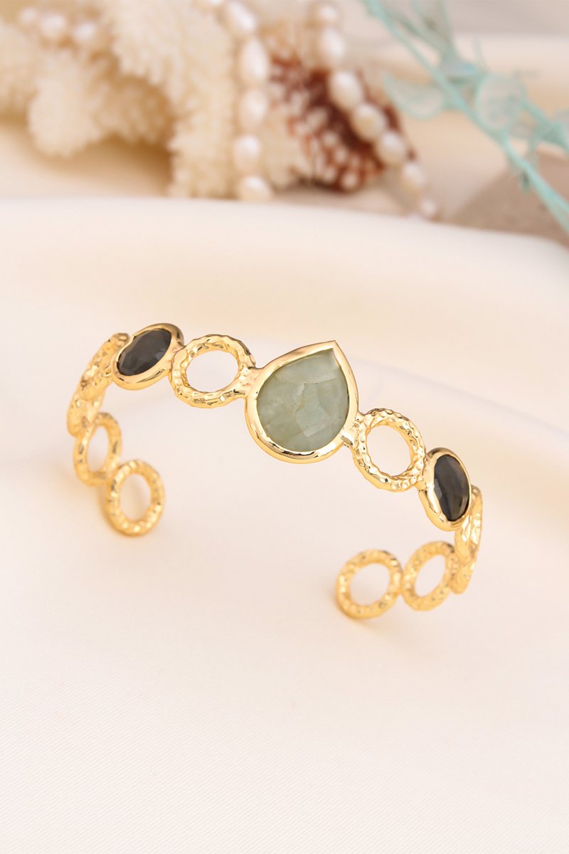 Open armband van doublé geelgoud ingelegd met 2 labradorieten en 1 prehniet.