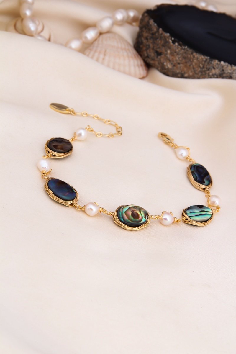 Materiaal: messing, koperkleurig, cultivéparels en parelmoer