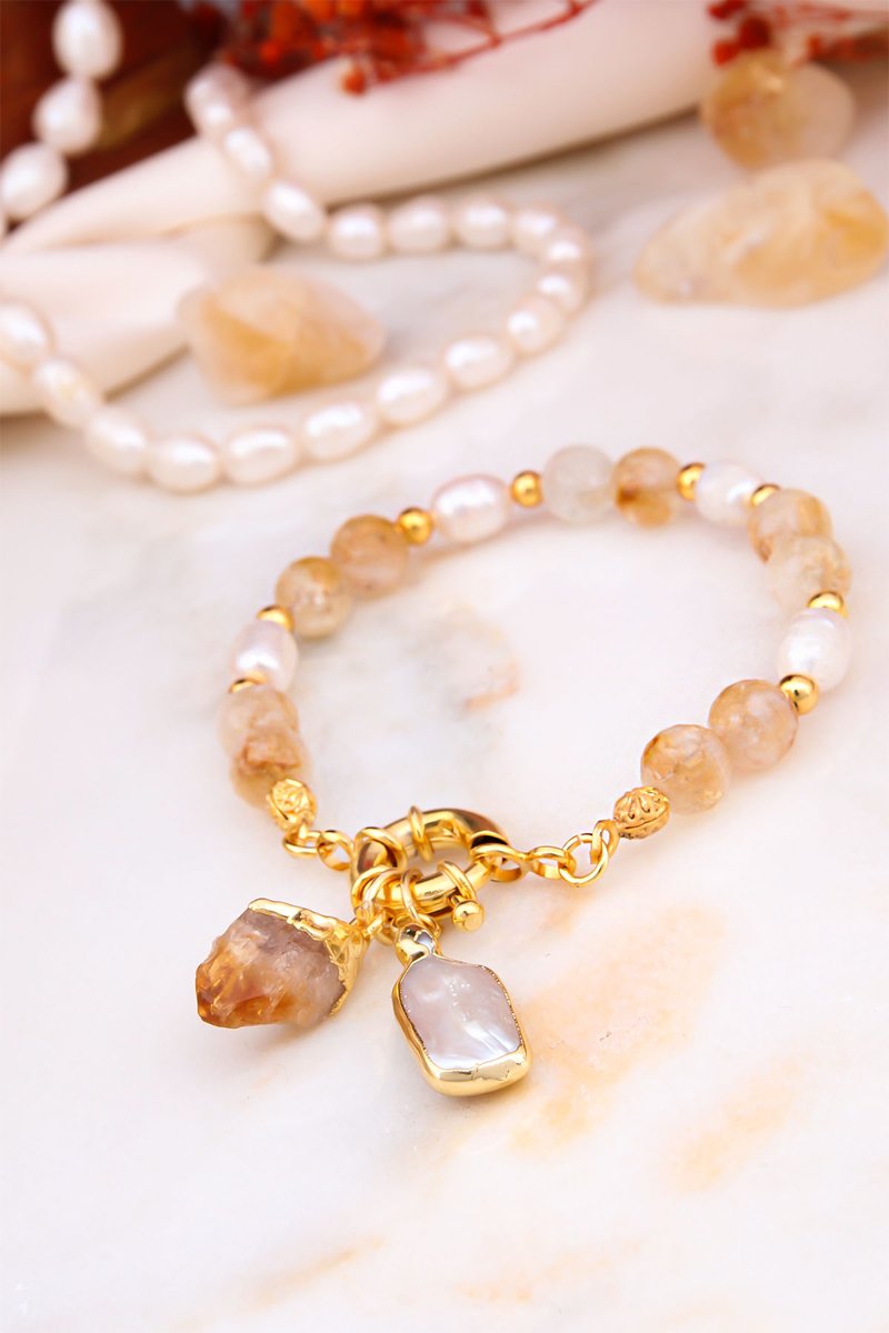 Elastische armband ingelegd met cultivéparels en citrienen.