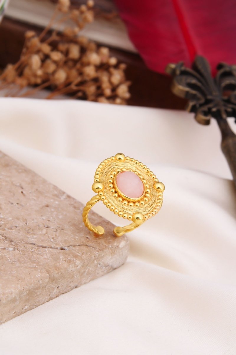 Verstelbare ring van doublé geelgoud ingelegd met 1 rozenkwarts.