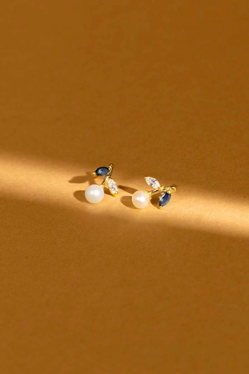 Oorbellen van geelgoud ingelegd met 1 zirkonia, 1 saffier en 1 kunstparel.