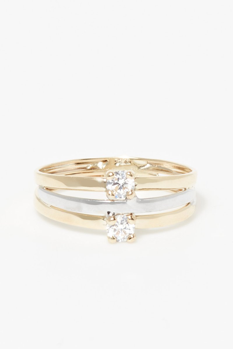 Ring van geelgoud, witgoud en roségoud ingelegd met 2 zirkonia's.