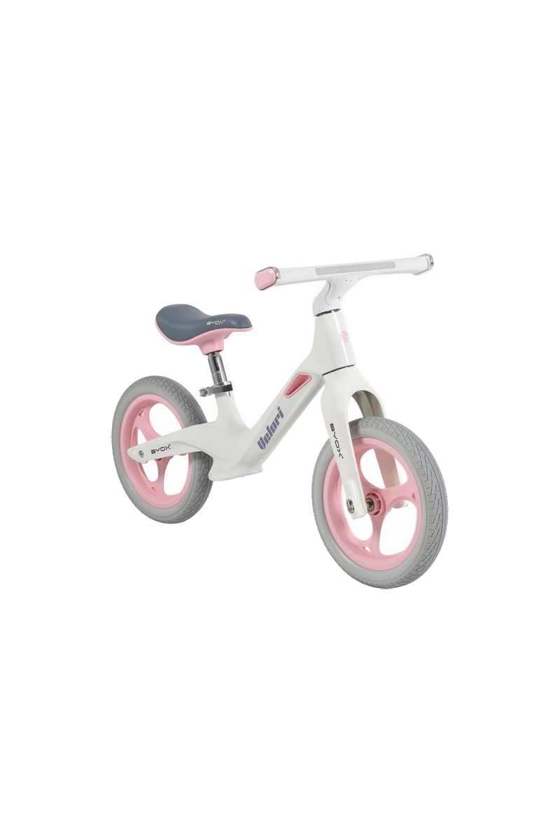 Het kind zit op het verstelbare zadel en duwt met zijn voeten om vooruit te komen, wat het evenwicht en de coördinatie ontwikkelt en hem voorbereidt voor op het leren fietsen.