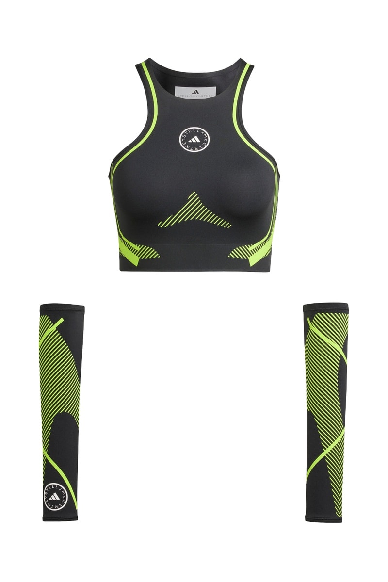 Streepmotief en logo op de linkermouw, aan de voorkant en aan de achterkant.