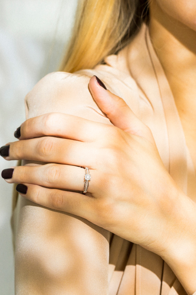 Verlovingsring van witgoud ingelegd met 28 diamanten.