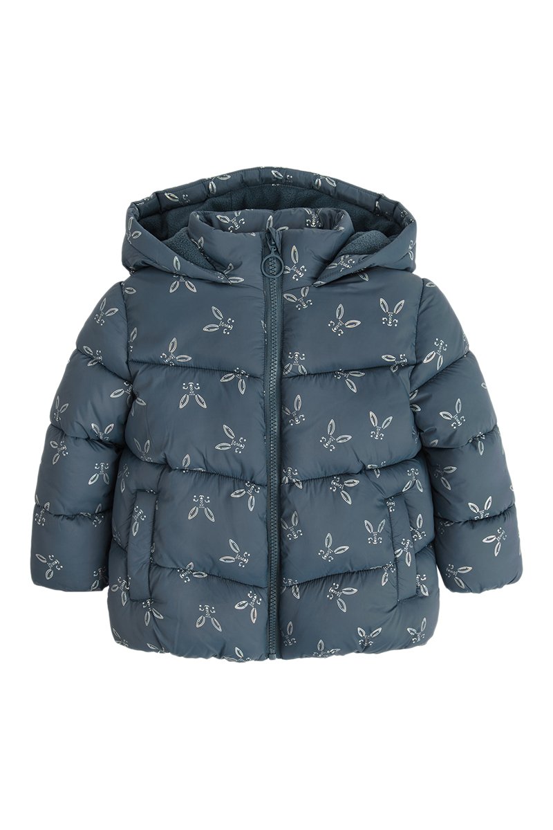 Gewatteerde jas met capuchon.