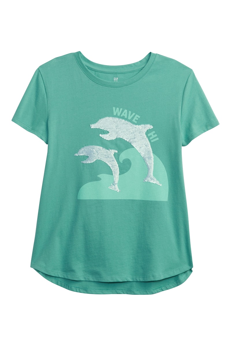 Belettering en dolfijnmotief met pailletten aan de voorkant.