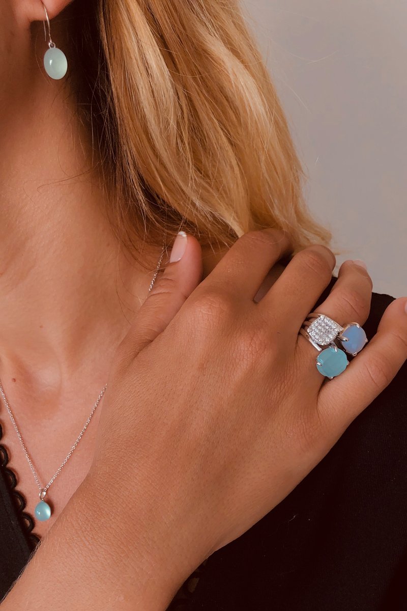 Materiaal: gerhodineerd sterling zilver 925/1000, chalcedonen en kristallen