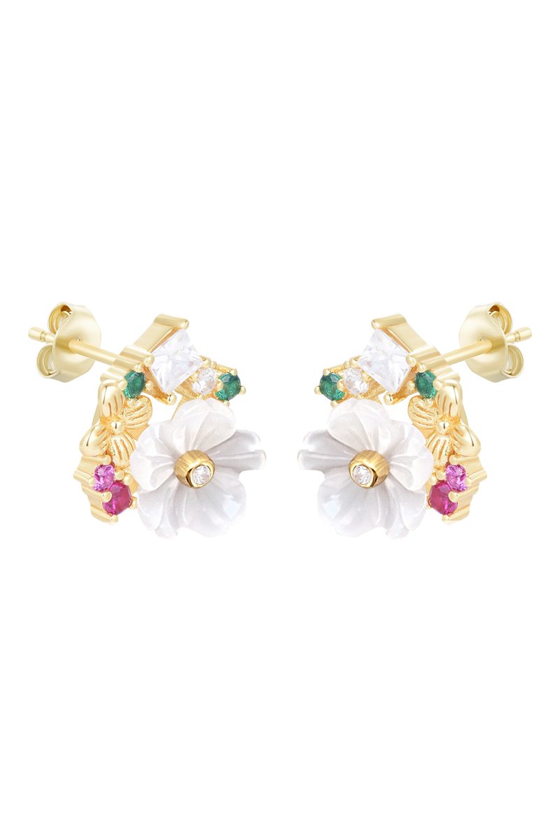 Hangende oorbellen van zilver doublé geelgoud ingelegd met parelmoer en zirkonia's.