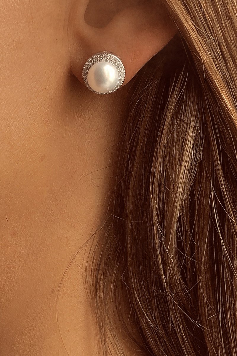 Oorbellen van zilver ingelegd met 1 cultivéparel en zirkonia's.