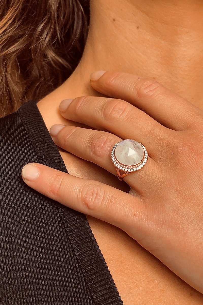 Ring van zilver ingelegd met 1 maansteen en zirkonia's.