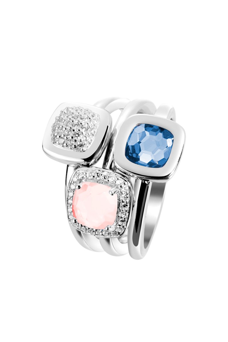 Ring van zilver ingelegd met zirkonia’s. 1 kwarts en 1 chalcedoon.