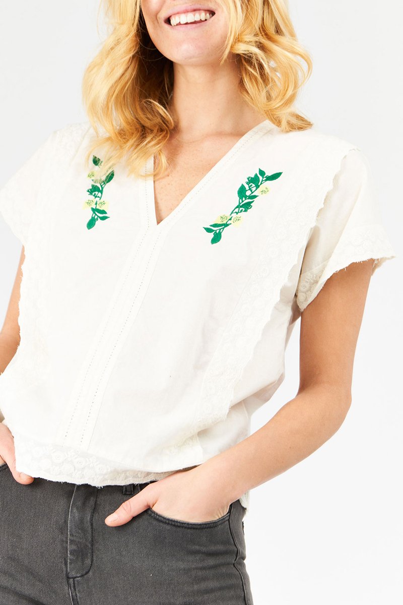 Details van guipurekant op de mouwen, aan de voorkant en aan de onderkant.