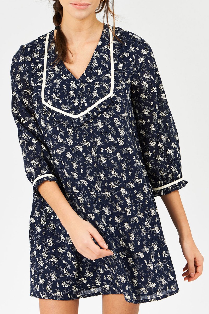 Ruches en contrasterende details op de mouwen en aan de voorkant.