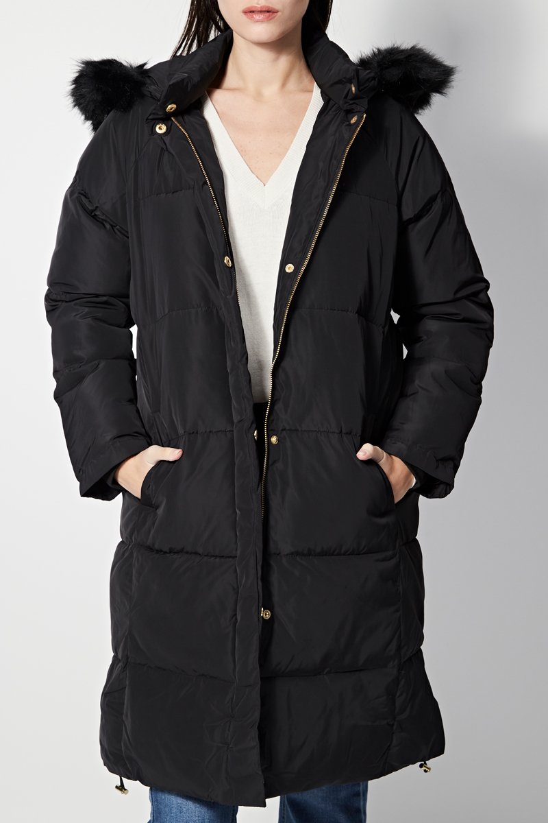 Afneembare capuchon met imitatiebont en trekkoorden.