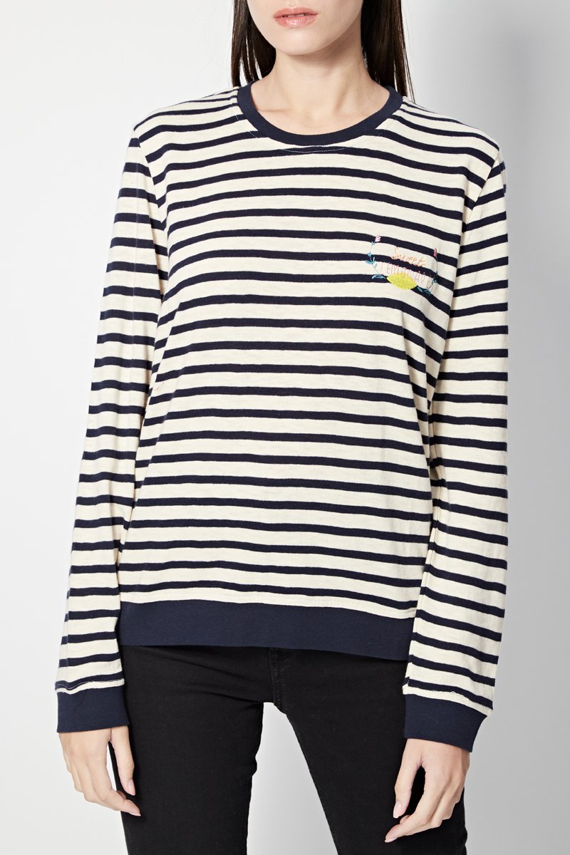 Belettering en geborduurd decoratief motief aan de voorkant.