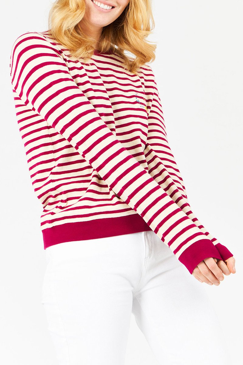 Belettering en geborduurd decoratief motief aan de voorkant.