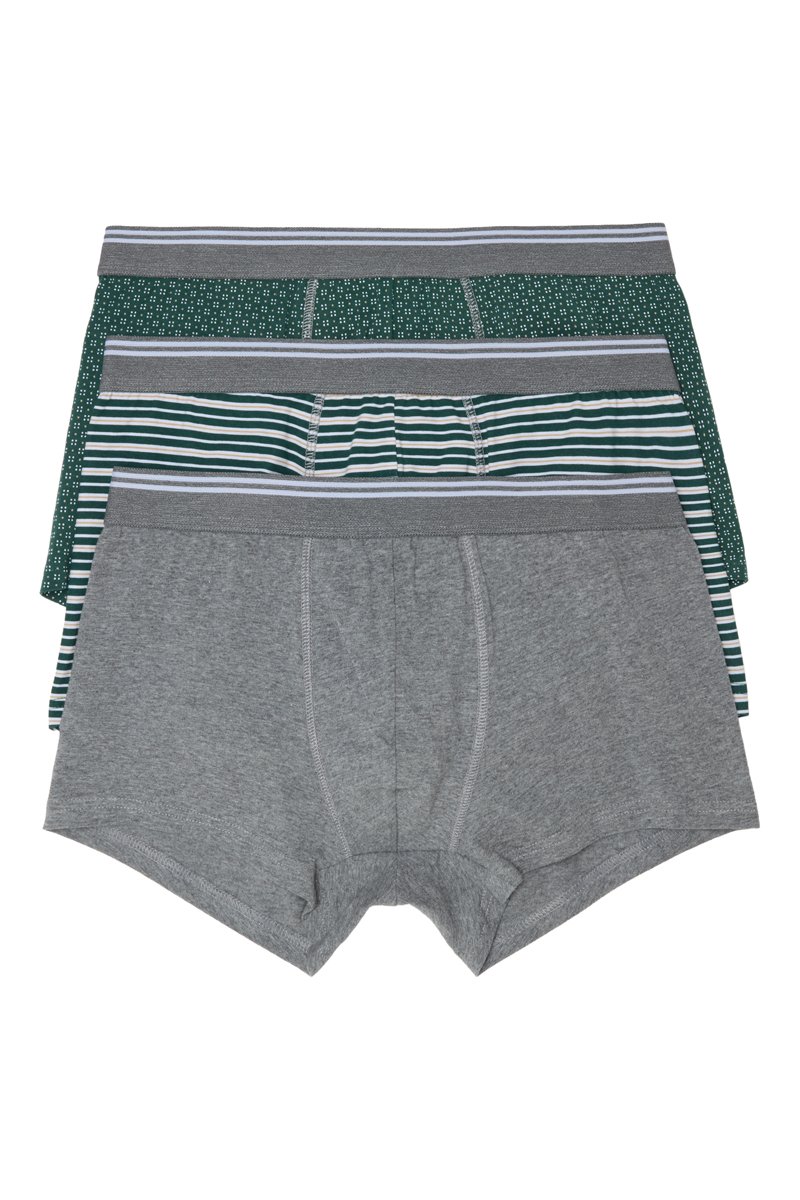 3 boxers van biologische katoenmix waarvan 1 met decoratief motief en 1 met streepmotief.