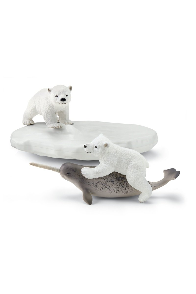 De grote ijsschots uit de schleich® WILD LIFE ijsberen glijpartij is tamelijk wankel. De twee ijsberen moeten bij het spelen oppassen dat ze niet in het water vallen! Eén beertje kwam te dicht bij de rand en is in het water gevallen! Gelukkig is de walrus in de buurt, die komt hem redden.