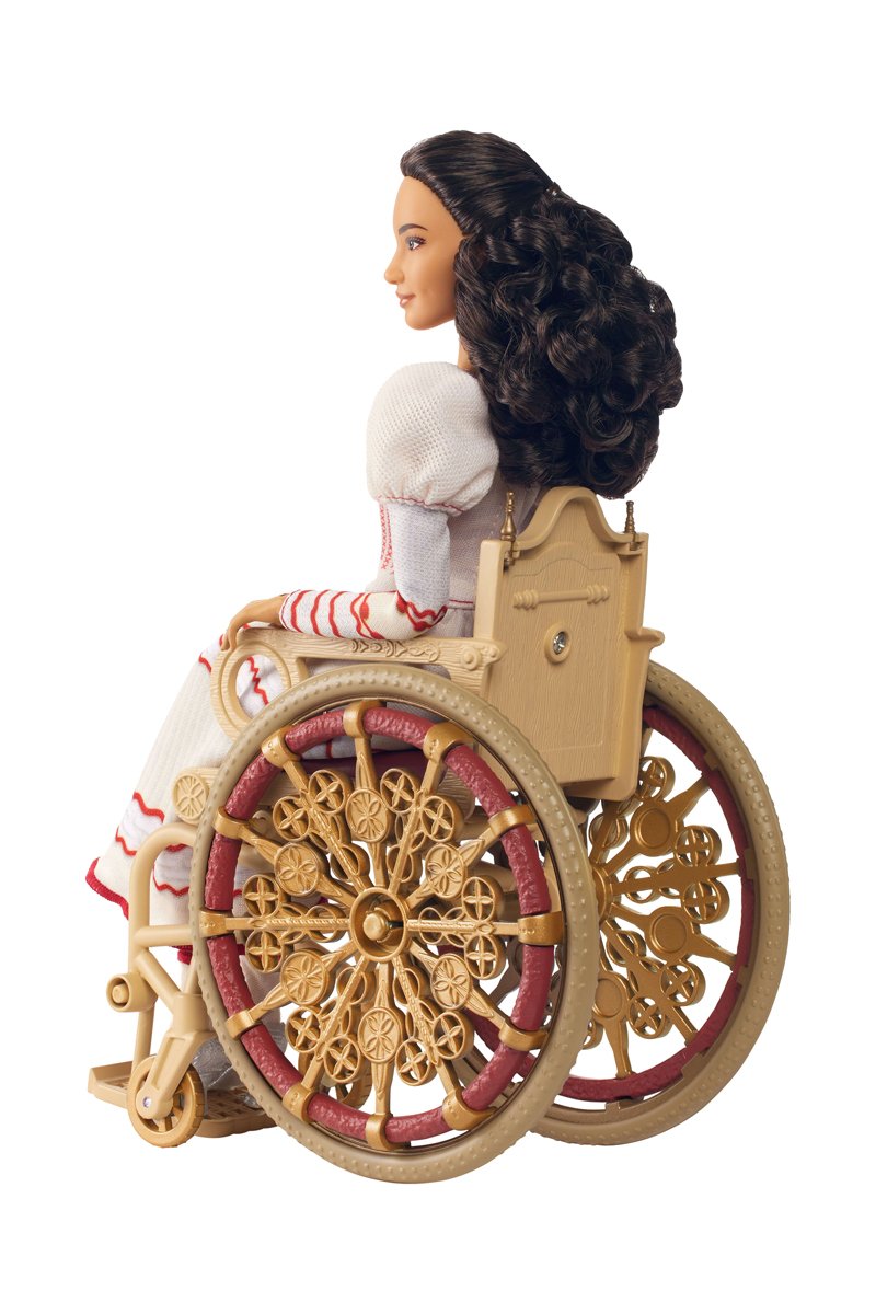 De pop Nessarose met haar zorgvuldig versierde gouden rolstoel draagt een afneembare outfit met gedetailleerde, gestructureerde patronen afgezet met rood, geaccessoriseerd met klassieke muiltjes verfraaid met enkele sieraden.