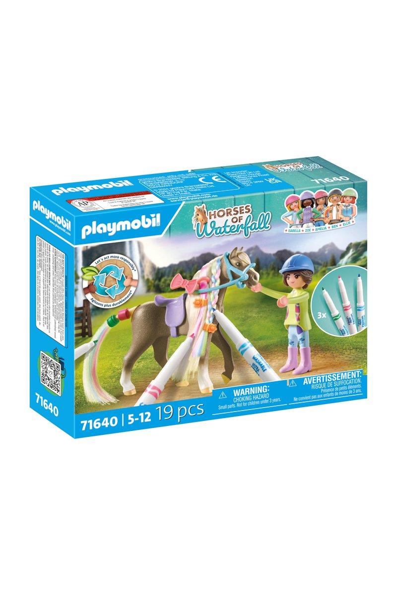 19 meegeleverde accessoires waaronder: figuurtje, paard, 3 viltstiften, krultang, speldjes voor het haar van je paard, kleurplaat..
