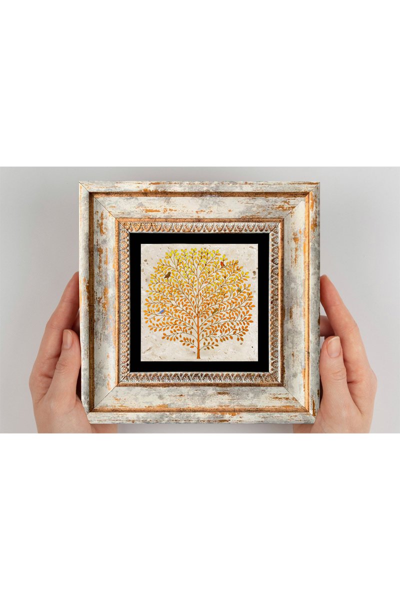 Wanddecoratie met lijst van steen en hout.