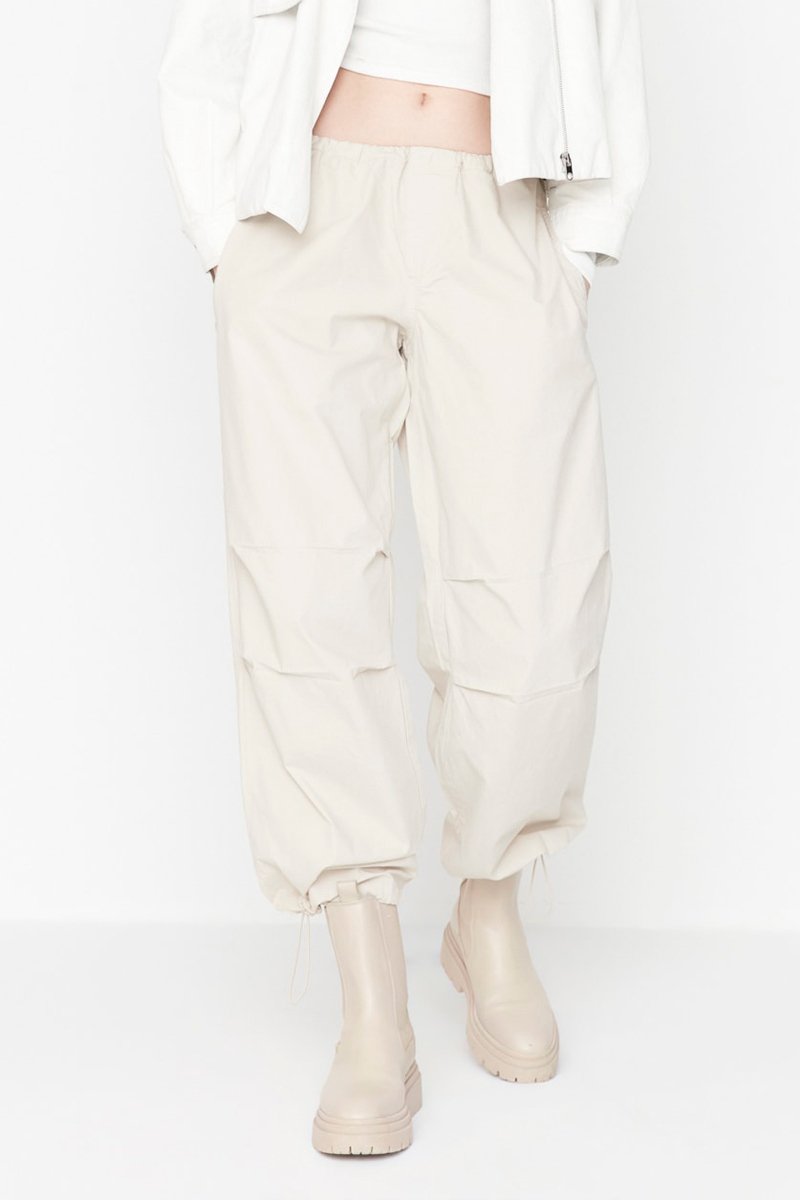 Trekkoorden en biezen in de taille en aan de onderkant.
