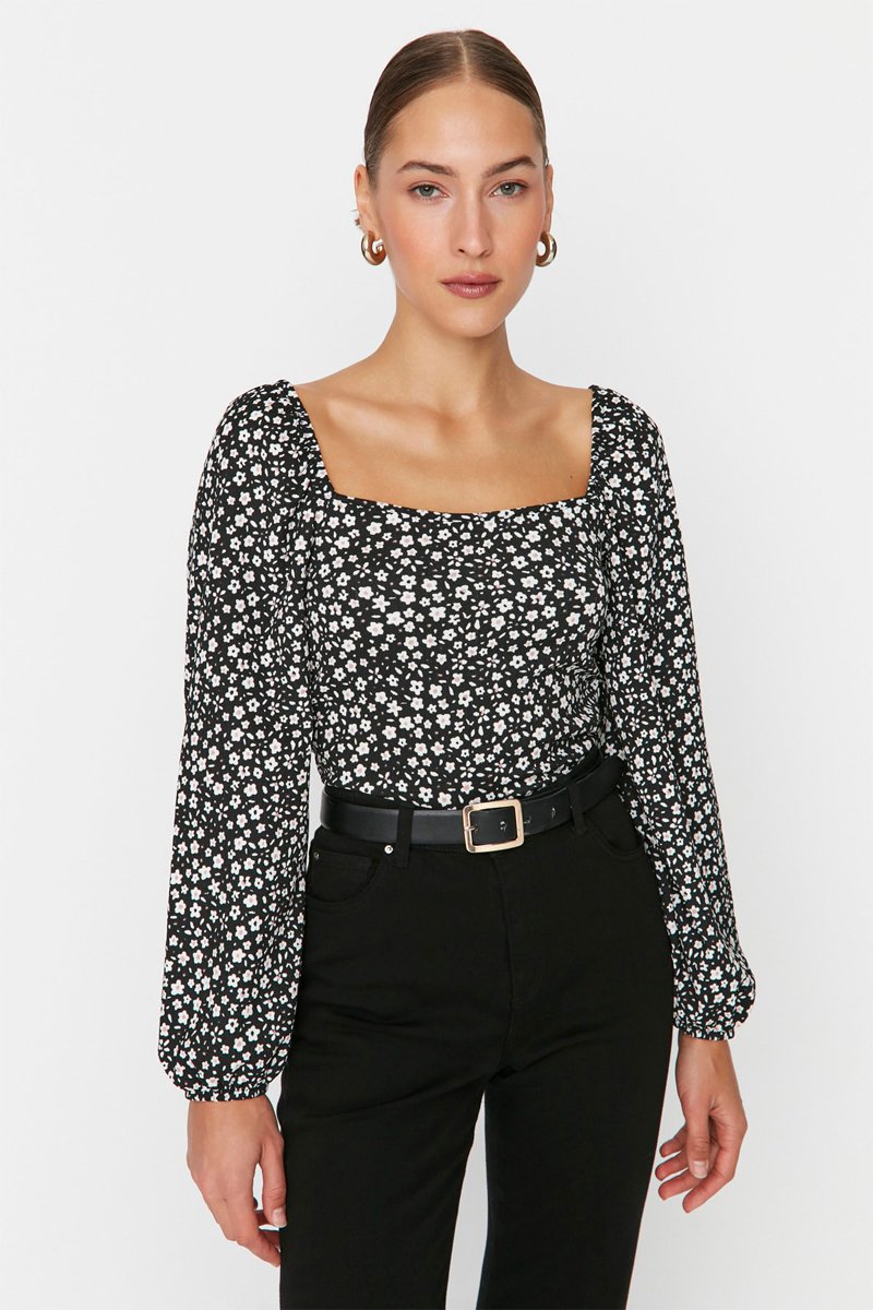 Top met Bloemmotief - Zwart