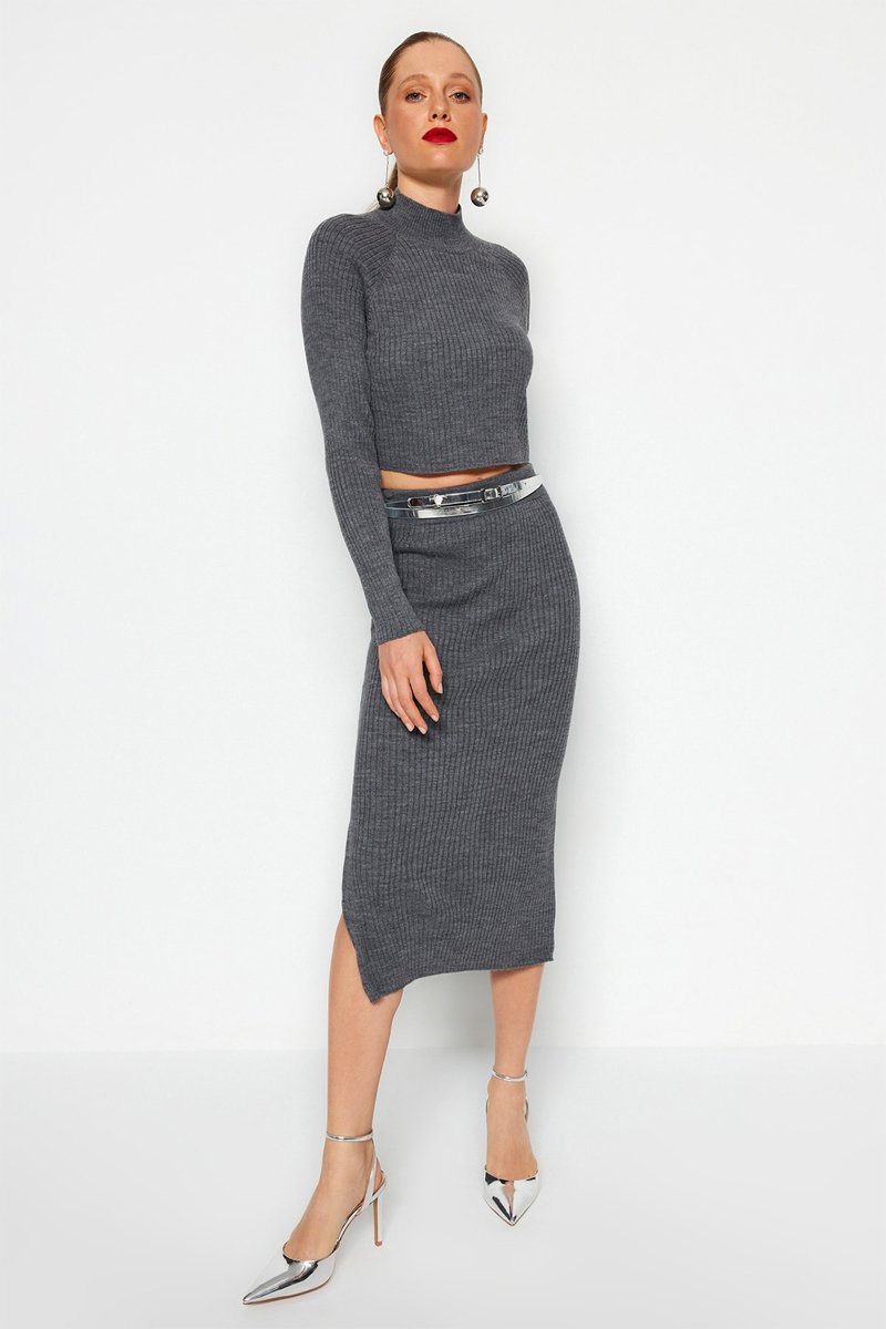 Trui en Midi-Rok Hoge Taille - Gemêleerd Antraciet