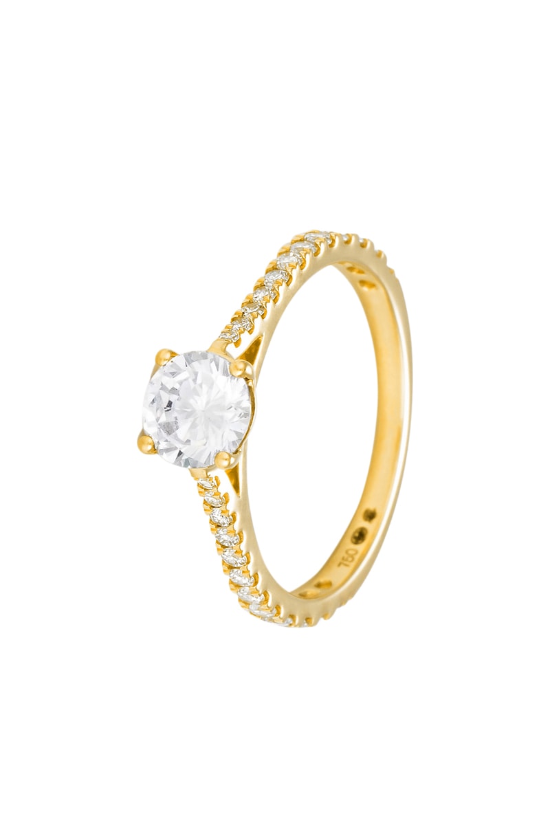 Materiaal: geelgoud 750/1000, diamanten 0,3 karaat/24 en solitaire 0,7 karaat/1