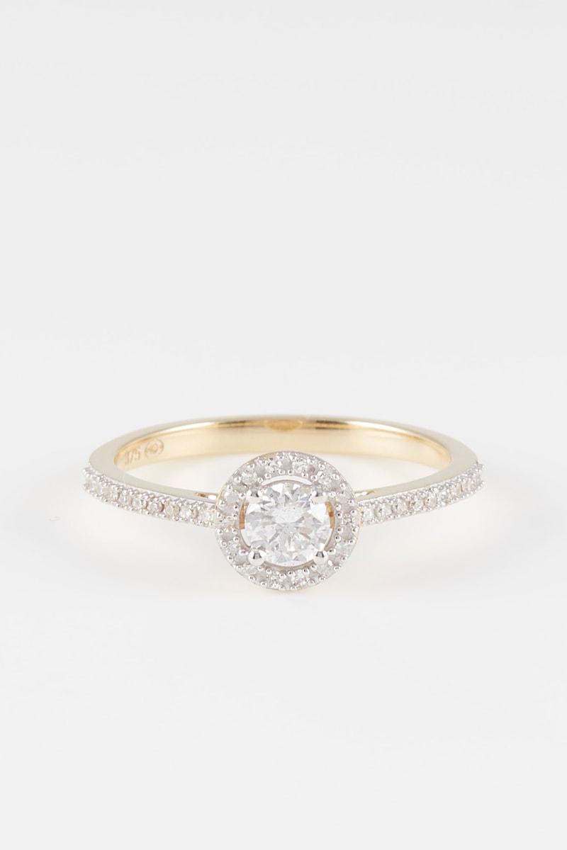 Materiaal: geelgoud 375/1000, diamanten 0,06 karaat/33 en solitaire 0,30 karaat/1