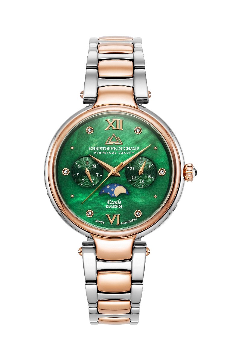 Wijzerplaat ingelegd met 6 saffierkristallen.