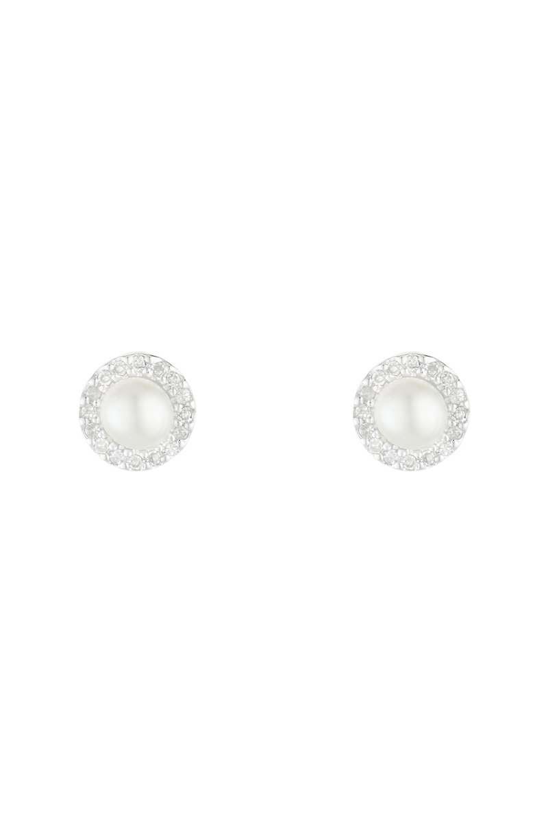 Oorbellen van witgoud ingelegd met 16 diamanten en 1 cultivéparel.