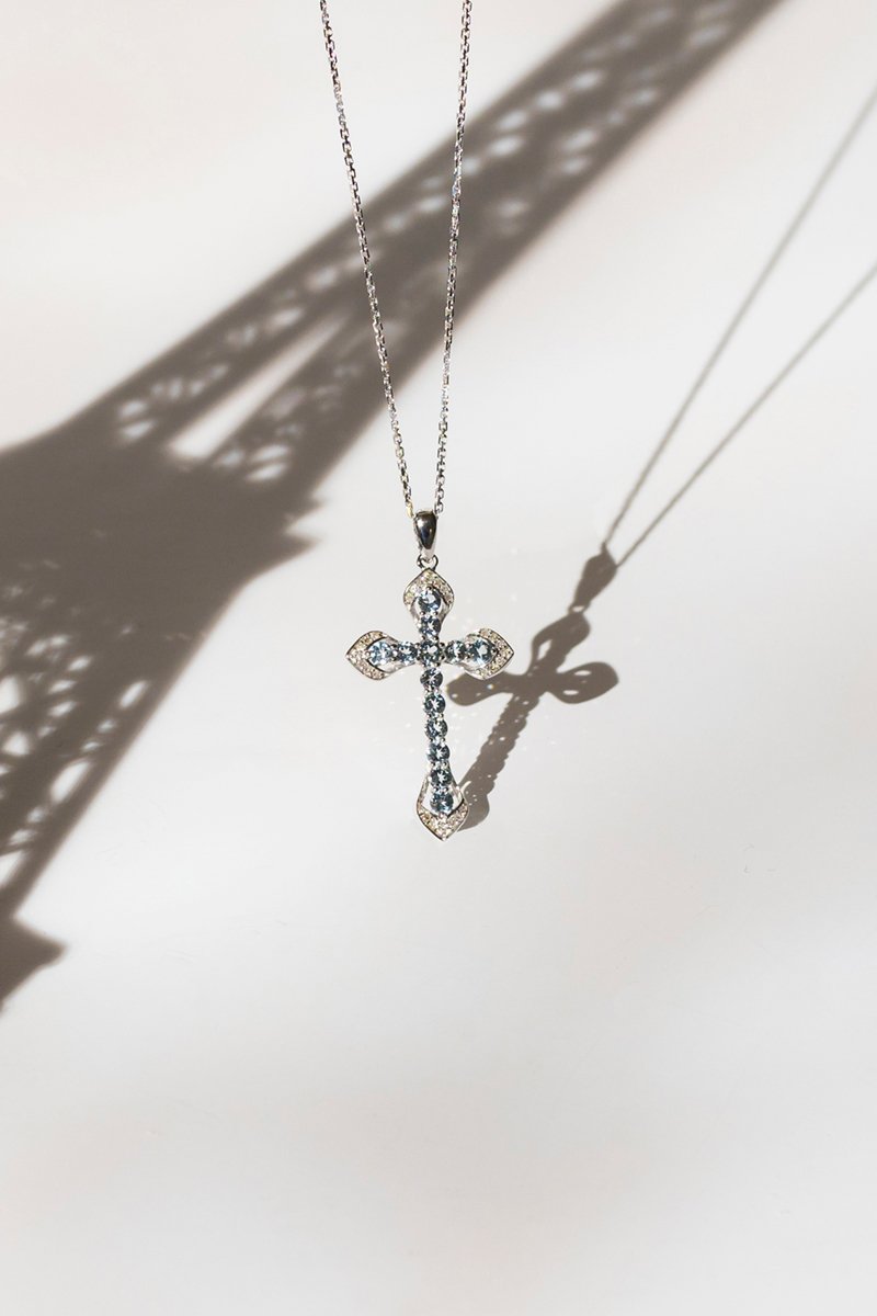 Hanger van witgoud ingelegd met 13 topazen en 28 diamanten.
