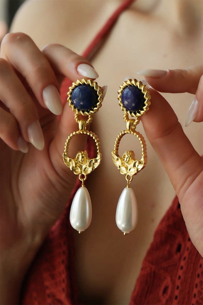 Materiaal: messing, koper, lapis-lazuli en kunstparels