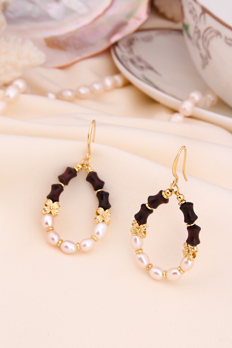 Hangende oorbellen van doublé geelgoud ingelegd met 5 kunstparels en 4 agaten.